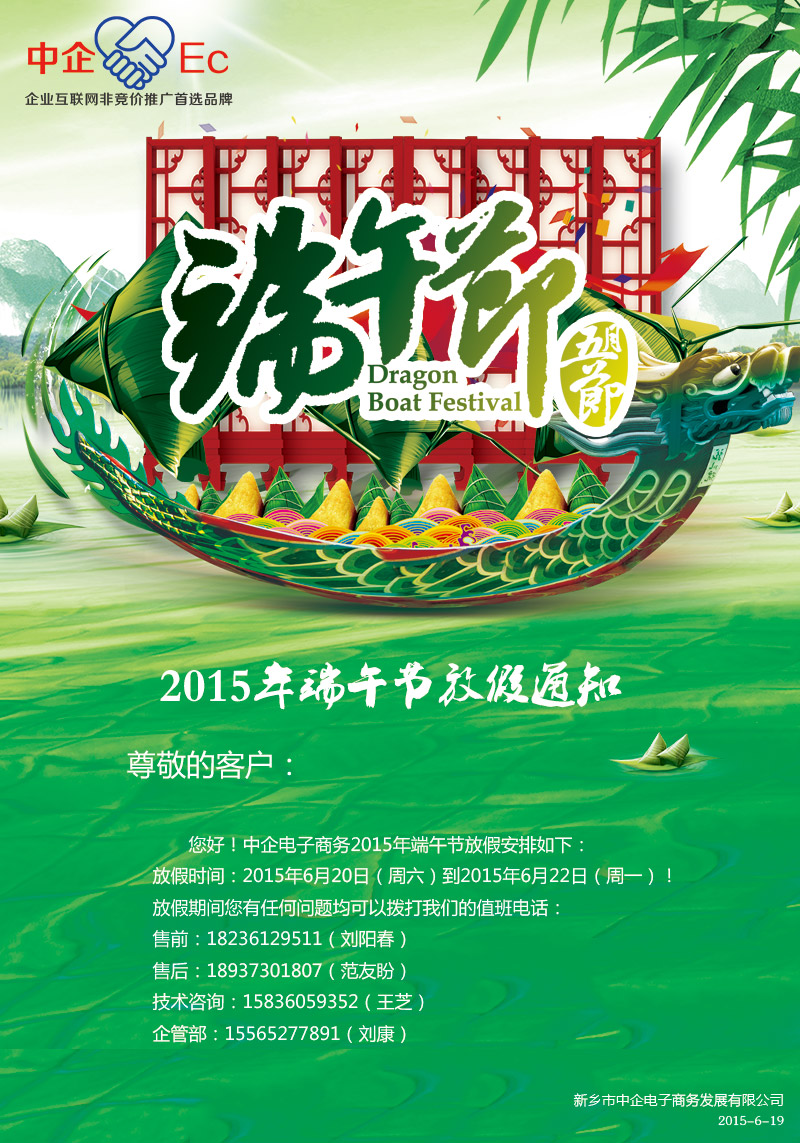 2015年中企電商端午節(jié)放假通知 更新時(shí)間:2015-06-19點(diǎn)擊次數(shù):7890次