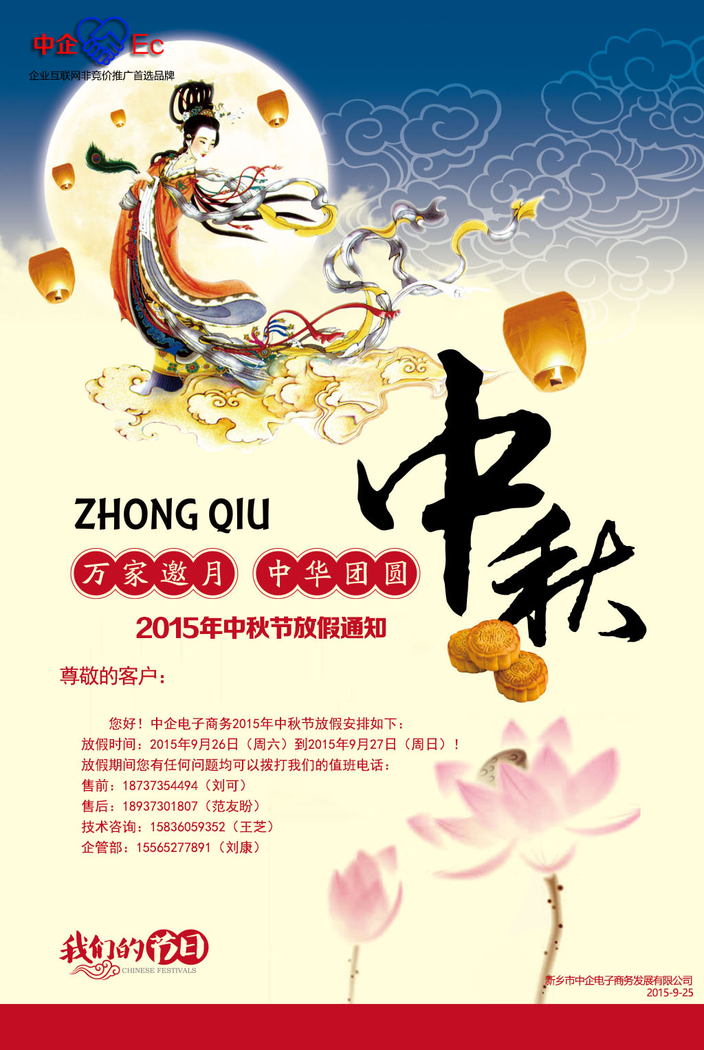 2015年中企電商中秋節(jié)放假通知 更新時(shí)間:2015-09-25點(diǎn)擊次數(shù):6696次